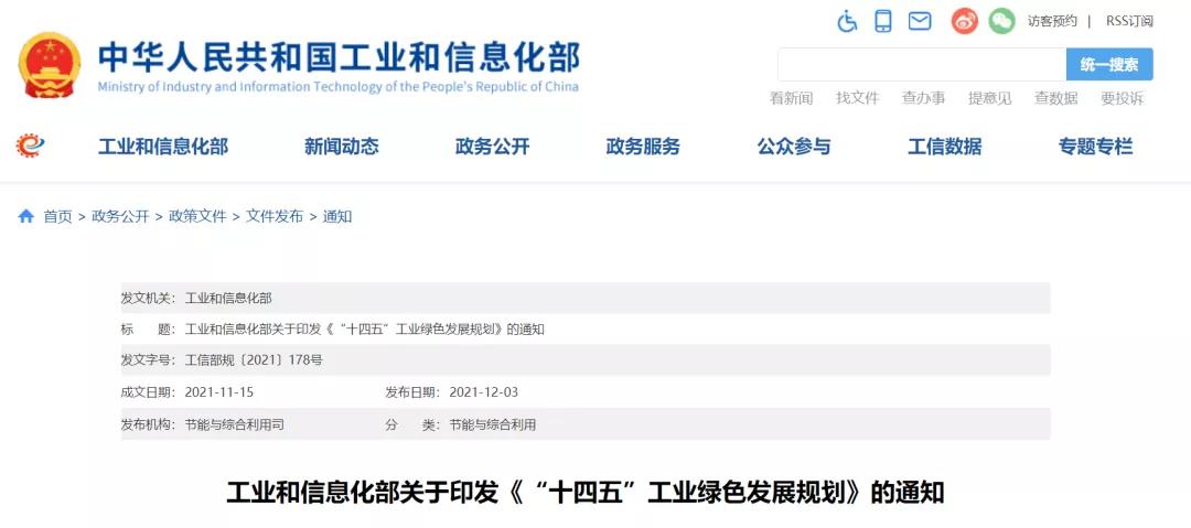12月3日,工业和信息化部发布了关于印发《“十四五”工业绿色发展规划》的通知。