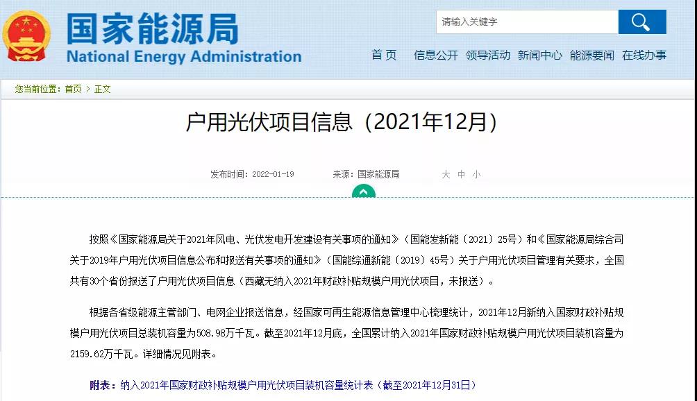 1月19日,国家能源局公示了2021年财政补贴户用光伏项目规模,全国累计纳入2021年国家财政补贴规模户用光伏项目装机容量为2159.62万千瓦,12月新纳入国家财政补贴规模户用光伏项目总装机容量为508.98万千瓦。